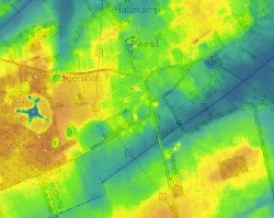 Waar op de hoogte met de hoogte in Peest? Het transformator huisje in Peest, wordt niet alleen gebruikt voor het verdelen van stroom. In dit gebouwtje bevindt zich aan de noordzijde een bout met de inscriptie C.D., waarschijnlijk is deze geplaatst door de Cultuurtechnische dienst, de voorloper van de Dienst Landinrichting. Vele andere peilmerken, zoals deze bouten officieel heten, zijn geplaatst door de toenmalige afdeling N.A.P van Rijkswaterstaat met de inscriptie N.A.P. Deze bouten werden (worden) gebruikt voor hoogtemetingen in de omgeving van Peest. Doch alvorens dit te kunnen doen moest deze bouten eerst worden aangesloten op het landelijk meetnet van het N.A.P. of te wel het Normaal Amsterdams Peil. Uit deze metingen blijkt dat deze bout een hoogte heeft van + 9,830 m (boven) N.A.P. Andere peilmerken rondom Peest zijn geplaatst in: huis Hoofdweg 7 met een hoogte van + 10,462 m. het huis Oude Norgerweg 2 hoogte + 10,547 m. het huis Veldweg 1 hoogte + 9,852 m. Uit deze gegevens blijkt dat de Peesters voorlopig niet bang hoeven te zijn voor natte voeten. Het laagste punt in Nederland is – 6,76 m. en hoogste punt + 322,70 m. (Vaalserberg). Over geheel Nederland is een puntenveld van 1 punt per vierkante meter in hoogte bepaald d.m.v. metingen vanuit een vliegtuig. Dit zijn metingen met laserlicht. Dit is het Algemeen Hoogte bestand Nederland het zgn. AHN. De nauwkeurigheid van deze punten is ca 10 cm. Het kaartje geeft een beeld van de hoogtes rond Peest. De hoogtes op bijgaand kaartje rondom Peest lopen van ca + 6,30 tot +10,50 m boven N.A.P Hoe donkerder blauw, hoe minder hoog het land ligt. De donker bruine kleuren geven juist de hoogste punten weer. De beekdalen rondom Peest zijn blauw gekleurd, de ijsbaan ligt + 7.80 m. boven N.A.P. Veel informatie over deze onderwerpen is via Google te vinden op het internet. |