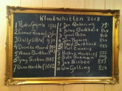 Bij de heren troefde Jan Bakering iedereen af, hier waren de verschillend minder groot tweede Tieme Barkhuis had slechts 11 worpen meer nodig. Uitslag klootschieten 2013 Dames 1. Riekje Geraedts 932 2. Lammie Remmeling 961 3. Aaltje Olthof 970 4. Dieneke Noord 990 5. Annie Barkhuis 1003 6. Giny Sieben 1005 7. Diena Hartlief 1012