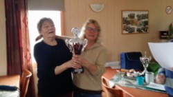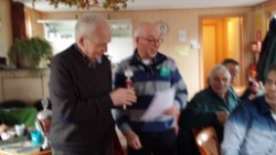 Zondag 29 januari startte weer de competitie, zoals gebruikelijk wordt op de eerste competitie zondag de resultaten van het afgelopen jaar bekend gemaakt. Het bijzondere van 2016 was wel dat er bij de dames twee kampioen waren. De dames Dina Hartlief en Riekje Geraedts hadden elk 968 punten. Bij de heren was John Penning met 783 punten de grote overwinnaar . De kampioenen van 2016 kregen een herinnerings bekertje. Henk Noord was als enigste ingedeeld bij de heren speciaal. De heren speciaal zijn inzetbaar bij de dames als daar te weinig deelnemers zijn. Aangezien Henk die rol het hele jaar door vrijwillig op zich genomen heeft verdiende hij een bijzondere trofee. Henk was aangenaam verrast met deze erkenning. Nog verraster waren Jan en Giny Sieben. Nadat hij de prijzen uitgereikt had, dacht Jan rustig aan de snert te kunnen beginnen. Het tegendeel was waar. Wim Gelling bood namens de clubleden hun een fraaie mand met voorjaarsplanten aan. Volgens Wim hadden zij dit verdiend voor hun werk voor en na het klootschieten. Jan en Giny waren er enigszins beduusd van maar vonden hem prachtig en werd in dank aanvaard. En toen kon men achter de snert. Riekje Geraedts had ook deze keer weer heel haar ziel en zaligheid er tegenaan gegooid, kortom ze smaakte weer uitstekend!