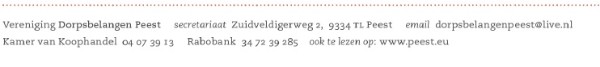 Op dinsdag 28 oktober 2014 vindt in Peest een dorpsschouw plaats. Bij deze dorpsschouw zijn bestuursleden van Dorpsbelangen Peest, de gemeentelijke contactambtenaar van ‘sociaal wijkbeheer’, de medewerkers van de buitendienst, de wijkagent, en de buurtwerker van Welzijn in Noordenveld aanwezig. Aandragen zaken voor de dorpsschouw Voorafgaand aan de dorpsschouw verzamelt de belangenvereniging punten ten aanzien van het dorp om tijdens de schouw te bekijken en te bespreken. Wij willen jullie bij deze vragen om ons daarbij te helpen en zaken bij ons aan te dragen die bij de dorpsschouw moeten worden meegenomen. Het kan hierbij gaan om problemen die te maken hebben met het onderhoud van het openbaar groen, straatwerk, straatmeubilair, bebordingen en verkeersveiligheid. Maar ook sociale vraagstukken zijn bedoeld voor de dorpsschouw.