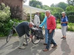 Kwamen fietsers uit Zeyen, Norg en Peest Naar de fam. Noord in Norg gesjeesd. Dertien fietsers, door ondersteuning aangedreven, Slechts twee moesten zelf al hun krachten geven. Door de Roeghoorns, over ’t Oostervoortse Diep, De fietsen geruisloos, ze gaven geen piep. Het Bunnerveen, langs Donderen, voorbij Het Rood Zand Was er toch wat vervelends aan de hand. Aaltje kon niet verder door problemen, Die ze toch echt wel ter harte moest nemen. Ze ging ons verlaten, wat erg jammer was. De rest ging naar Vries voor een zonnig terras. Koffie of thee en gebak Werden genuttigd met gemak. Naar het meisje van Yde, gevonden in ’t veen En om de verlenging van start -/ landingsbaan Eelde heen. Via Esweg naar De Punt, het chauffeurscafé. Iets gedronken, gegeten, we zeiden tabé Naar Vries, stille kant van ’t Noord – Willemskanaal, Tegenwind, druppels, opeens veel kabaal. De kopgroep met ondersteuning, je weet ’t dan wel, Voor een paar uit de groep ging ’t veel te snel. In de Achterste Holten, houd ze maar eens in toom, Gooiden allen met een steen op een boom. Dineke gooide steeds heel vlug, De steen naar de groep terug. Eénmaal had ze toen geluk, Want bijna was een voorwiel stuk. Via Zeijerlaar en Het Rood Zand, Voor thee of ijs naar De Bosrand. Maar bij Donderboerkamp, wat was daar aan de hand? Ene Roelie kreeg een lekke band!