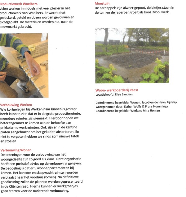 Vakantie Sommige bewoners zijn op vakantie geweest en hebben mooie herinneringen gemaakt, andere bewoners hebben vanuit Peest leuke momenten meegemaakt. Triple C Begin oktober zijn er wederom begeleiders geschoold in de methodiek triple C. Er zijn nog een aantal begeleiders die nog niet geschoold zijn, zij worden in november geschoold. De agenda’s en het format van de MDO’s (Multi Disciplinair Overleg) zijn inmiddels aangepast zodat triple C op die manier meer geïmplementeerd wordt in het werken binnen woon-werkboerderij Peest. Kuikens Afgelopen zomer heeft een ieder genoten van de kuikens en het proces van de eitjes in de broedmachine tot het uitkomen en de snelle groei van de kuikens tot kippen.